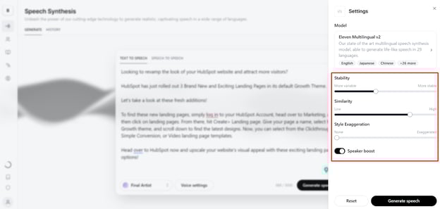 - You can utilize the "Voice Settings" button to tailor parameters such as Voice Stability, Voice Similarity, and Style Exaggeration to your preferences.
