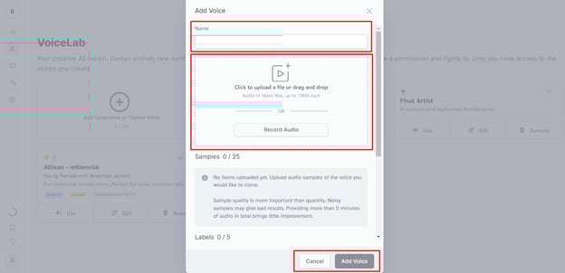 - Upload several short voiceover samples, each under 10 MB, to ensure expression variations in the voiceovers.