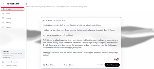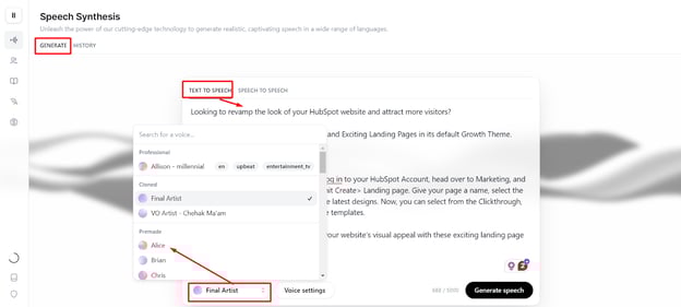 - Once adjustments are finalized, click on "Generate Speech" to create the voiceover.