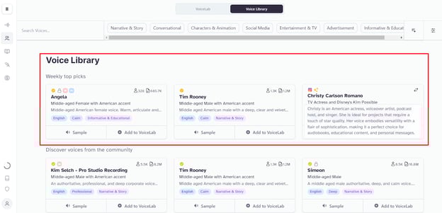 - Locate the "Search for Voice" button and choose a suitable voice from ElevenLabs Library or create a cloned voice (explained in the next section).