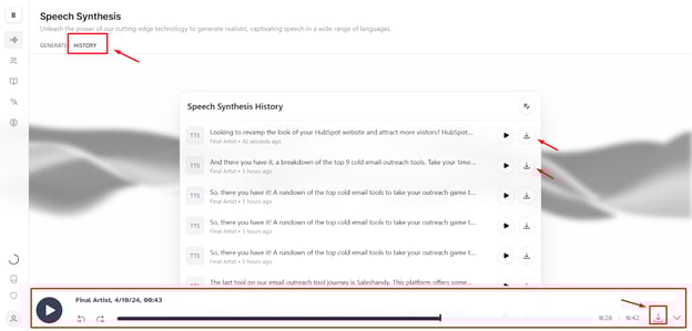 - You can download the generated voiceover directly from the slider below or the "History" tab.