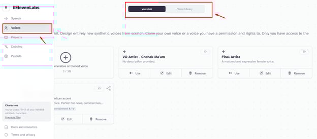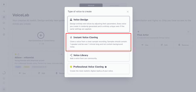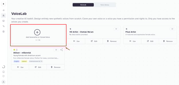 - Go to the Voice Lab tab and Select "Add Generative or Clone Voice."