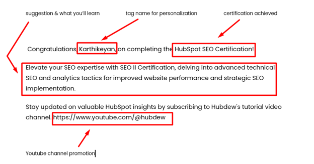 - Provide guidance on the next certification or course the individual can pursue. (You can refer to HubSpot Academy for detailed information). Ensure your suggestion aligns with their latest achievement.
